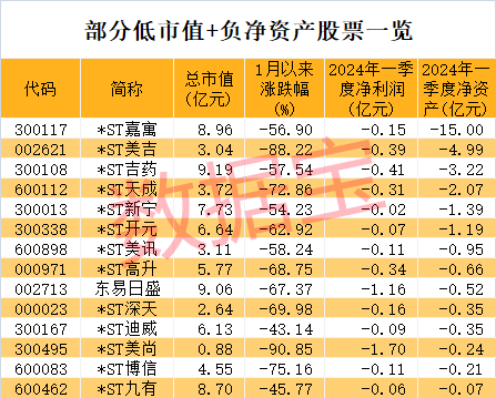 据证券时报·数据宝统计,截至7月22日收盘,A股市值低于10亿元的股票接近250只。以这250只股票为基础,从中筛选出业绩亏损较多的公司名单,条件如下:1.2023年及2024年一季度净利润均亏损;2.2024年一季度末净资产为负值。