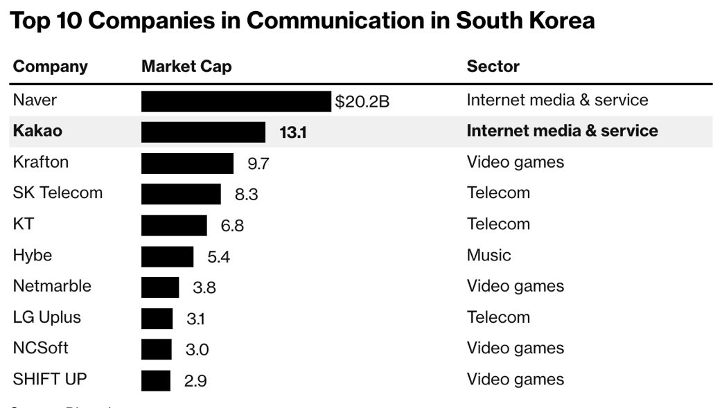自2021年创下历史高点以来,Kakao的股价已下跌超过75%,但彭博社汇编数据显示,Kakao目前依旧排在韩国十大通信公司第二位。