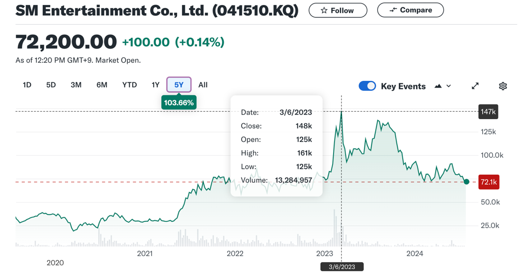 去年3月,经过与Hybe的激烈竞购战,Kakao赢得了SM娱乐的控股权。此后,韩国当地金融监管机构指控Kakao购买了2400亿韩元的SM娱乐股份,以破坏Hybe的报价。韩国当局还于2023年10月逮捕了Kakao的首席投资官裴在铉,指控他涉嫌股价操纵。数据显示,这场竞购战也使SM娱乐的股价在2023年3月飙升至创纪录高点。