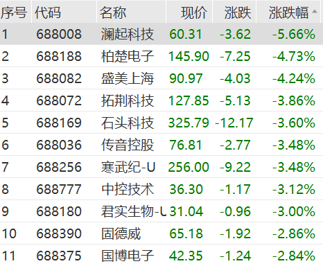 截至发稿,科创50指数跌幅扩大至超2%,澜起科技跌6%领跌成分股。