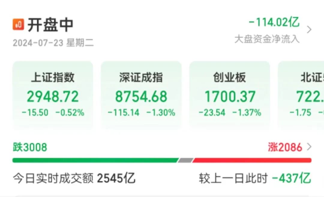 7月23日,A股三大指数集体低开。截至发稿,A股主要指数均未翻红。