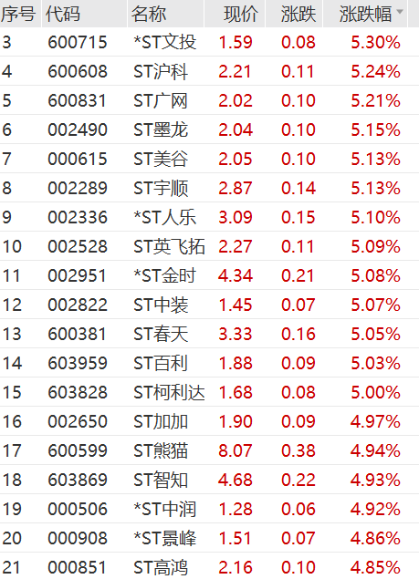 其中,*ST景峰15连板,ST春天9连板,*ST中润5连板。