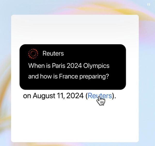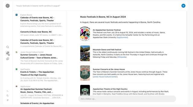 OpenAI官网介绍,SearchGPT的宗旨是,通过在搜索中突出显示引用内容和链接,帮助用户与发行商建立联系。SearchGPT的响应中有清晰、内联、有命名的归属和链接,因此用户将知道信息来自何处,并且可以在带有源链接的侧边栏中快速获取更多搜寻结果。