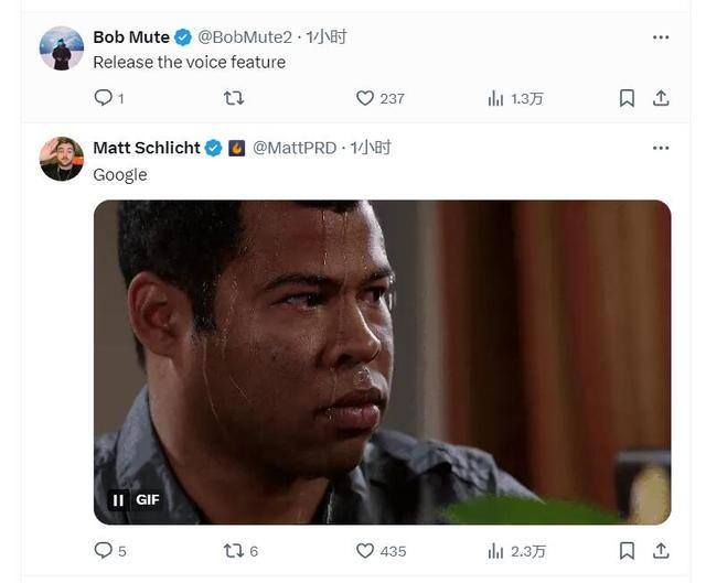 OpenAI官宣测试搜索功能后,社交媒体上,有网友配了一名男子流汗的动图,比喻谷歌现在要急得流汗了,这条成为超过2万高赞的热门评论。还有一条点赞过万的网友评论呼吁OpenAI,发布AI语音功能。