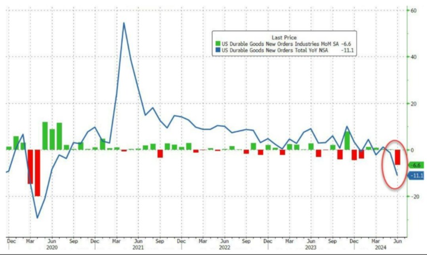 其中,运输和资本货物订单在6月的降幅最大,其中非国防飞机和零部件订单的降幅最大。