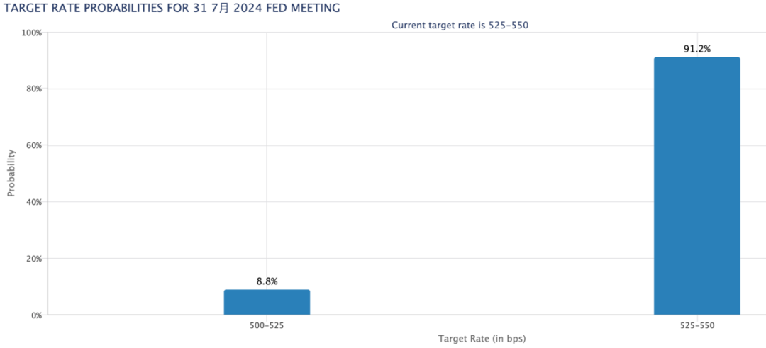 数据公布后,CME“美联储观察”工具显示的降息概率变化不大,美联储9月降息概率维持100%,但7月降息的概率已不足10%。