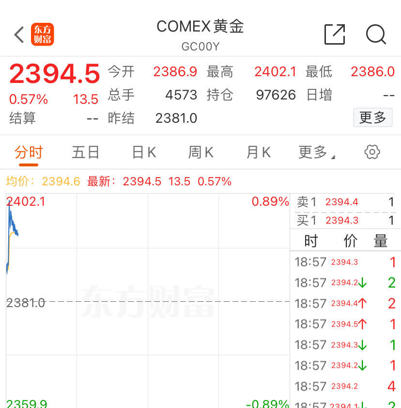 纽约黄金暂报2394.5美元/盎司,日内涨0.57%。