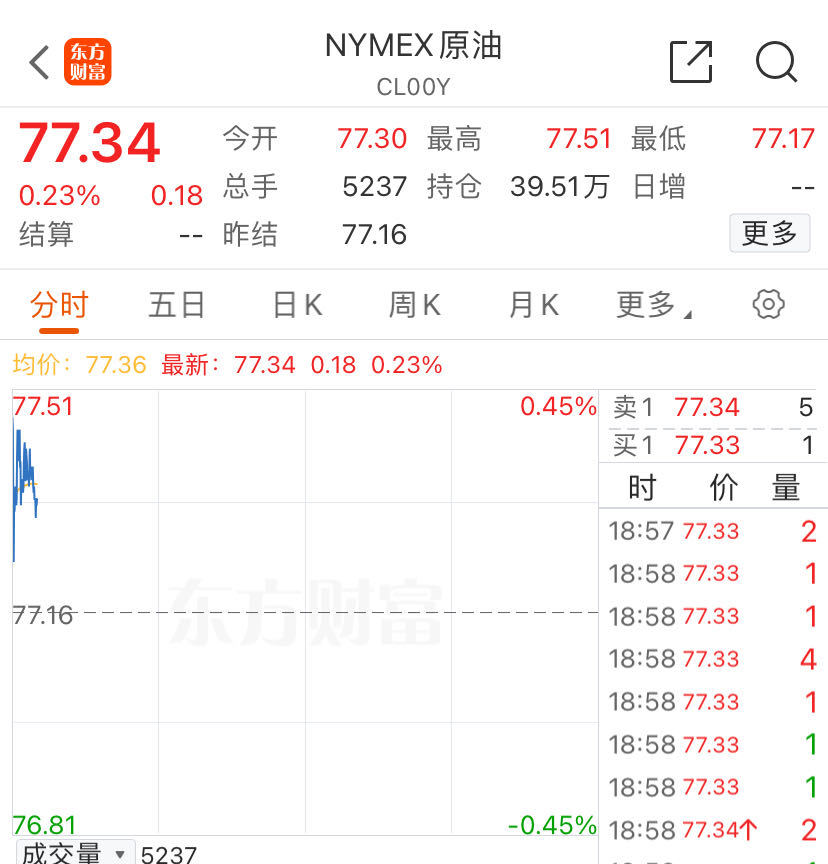 纽约原油开盘涨至77.34美元/桶,涨幅0.23%。