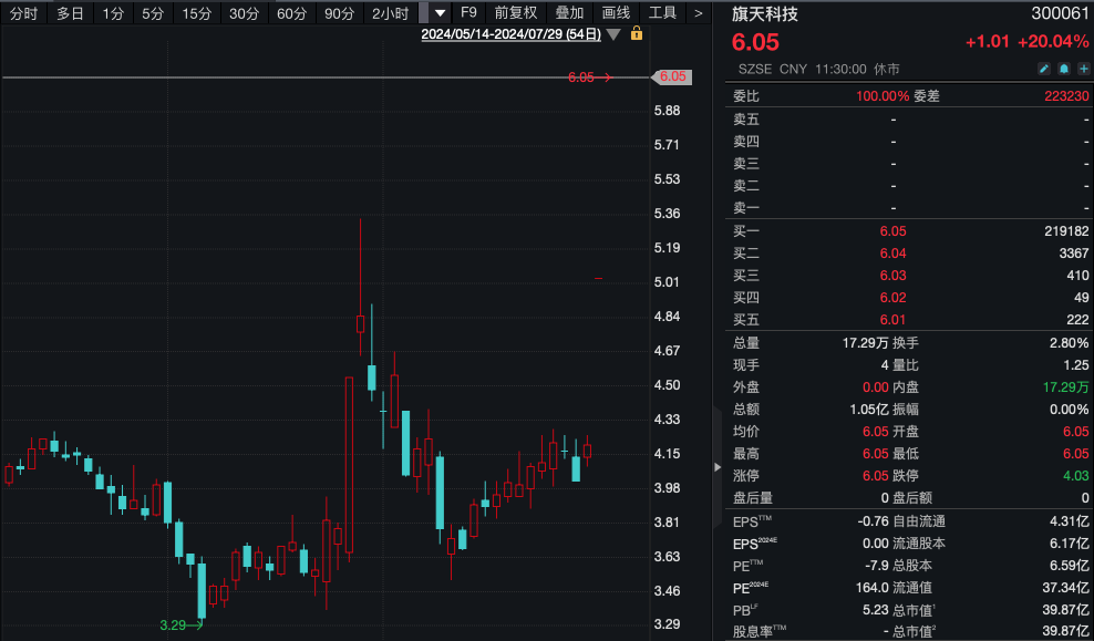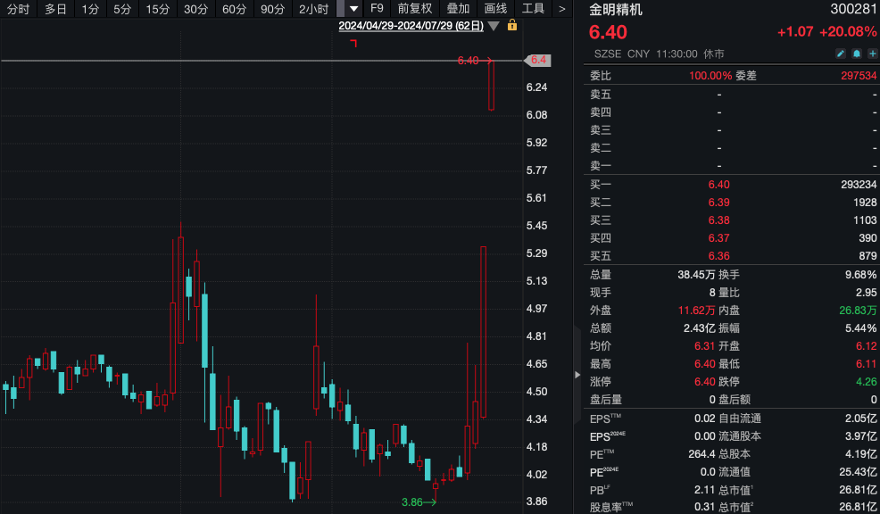 旗天科技连续第2日开盘20%一字涨停;金明精机高开后亦秒速20cm封板,同样连续2日涨停,股价创2年半来新高。