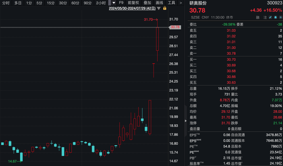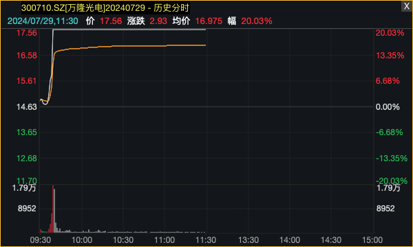 万隆光电开盘不到10分钟垂直20%涨停;研奥股份在连续2日20cm涨停后,今日盘中再度触及涨停;启明信息开盘一字涨停,近5日4涨停,股价创年内新高;航天晨光、万集科技等批量涨停或涨超10%。