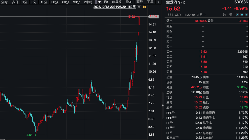 金龙汽车14个交易日内实现8涨停,累计大涨112%。交运股份、宝塔实业、中通客车、潍柴重机等均走出连续涨停的行情。