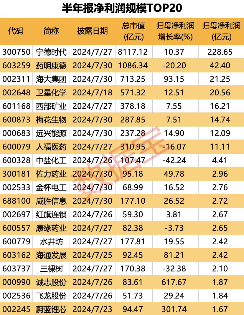 据证券时报·数据宝统计,截至7月29日,A股市场共计50家上市公司发布了2024年半年报。从净利润规模看,宁德时代暂居首位,为228.65亿元;药明康德排在次席,为42.4亿元;海大集团和卫星化学净利润规模也在20亿元以上。