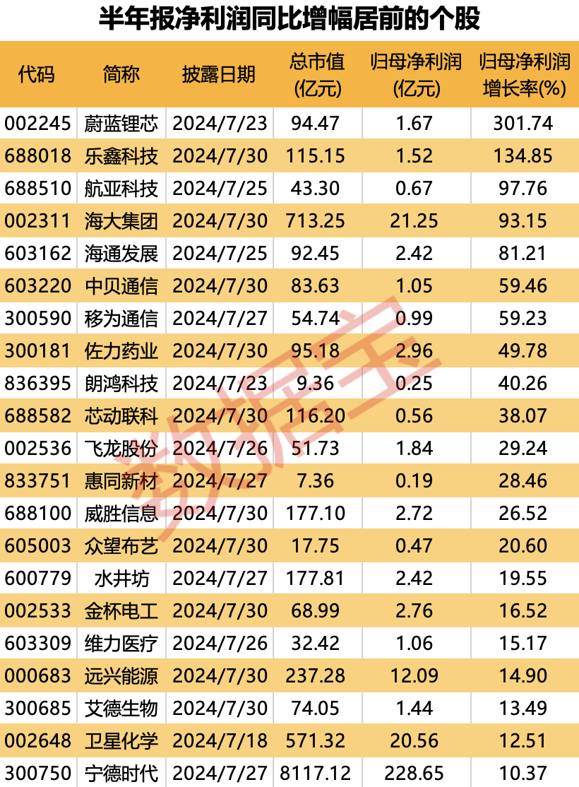 从净利润同比增幅来看,蔚蓝锂芯、乐鑫科技净利润翻倍,同比增幅依次为301.74%、134.85%;航亚科技和海大集团净利润增速均超过90%。
