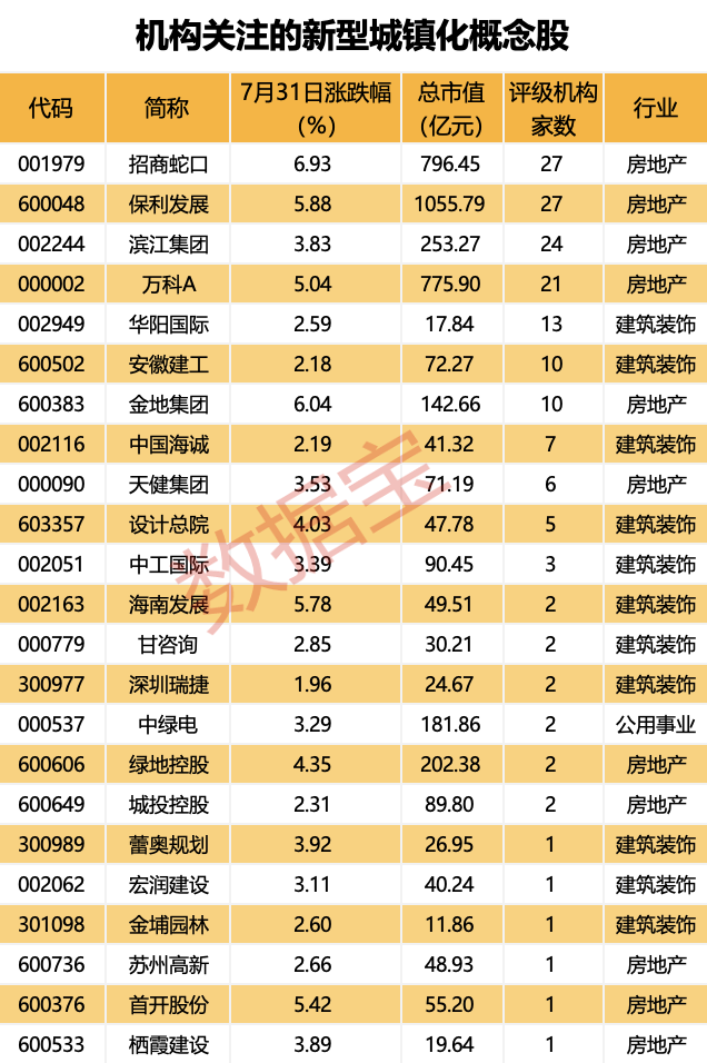 据证券时报·数据宝统计,A股中,布局新型城镇化的上市公司共有79家,7月31日集体上涨,海南瑞泽涨停,艾布鲁涨10%以上,招商蛇口、金地集团、保利发展等涨超5%。
