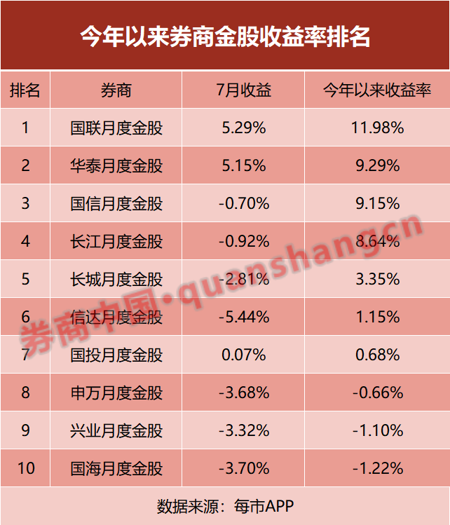 截至今年7月末,在每市APP收录的47家券商金股数据中,共有7家券商年内金股组合收益率为正。其中,国联证券金股以11.98%的年内收益率排名第一,华泰证券、国信证券金股排名第二、第三,年内收益率均超9%。