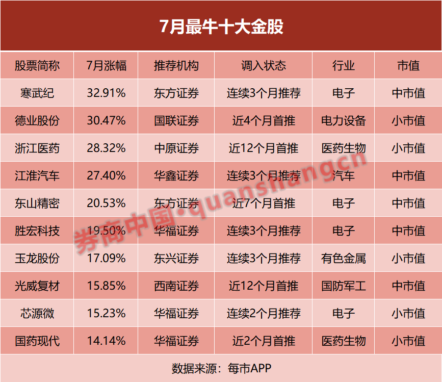 每市APP显示,7月金股中,由东方证券推荐的寒武纪-U以32.91%的月度涨幅位居第一;由国联证券推荐的德业股份则以30.47%的月涨幅排名第二,中原证券推荐的浙江医药则排名第三。