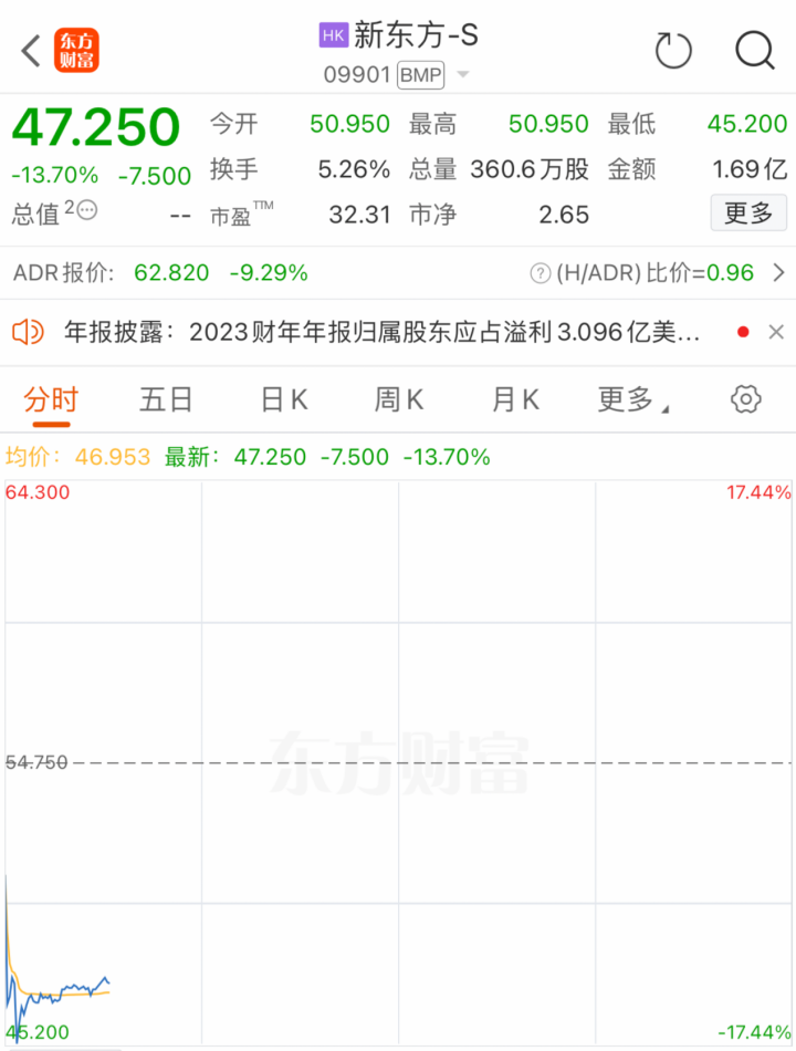 由于业绩不及预期,新东方隔夜美股股价大幅收跌9.29%,报62.82美元/股。