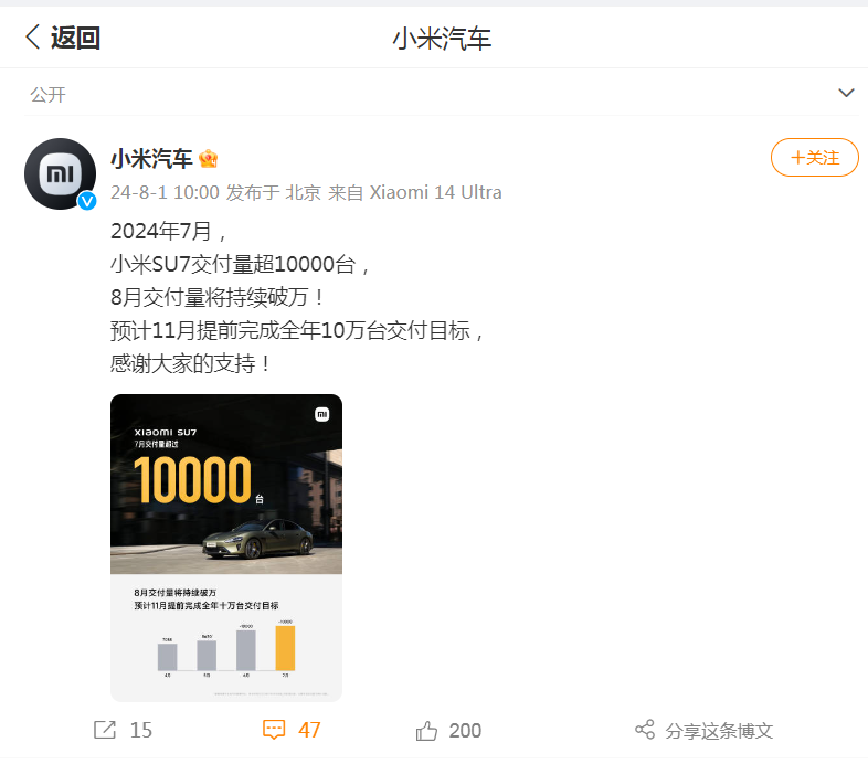 据小米汽车官方微博8月1日消息,7月小米SU7交付量超10000台,8月交付量将持续破万,预计11月提前完成全年10万台交付目标。