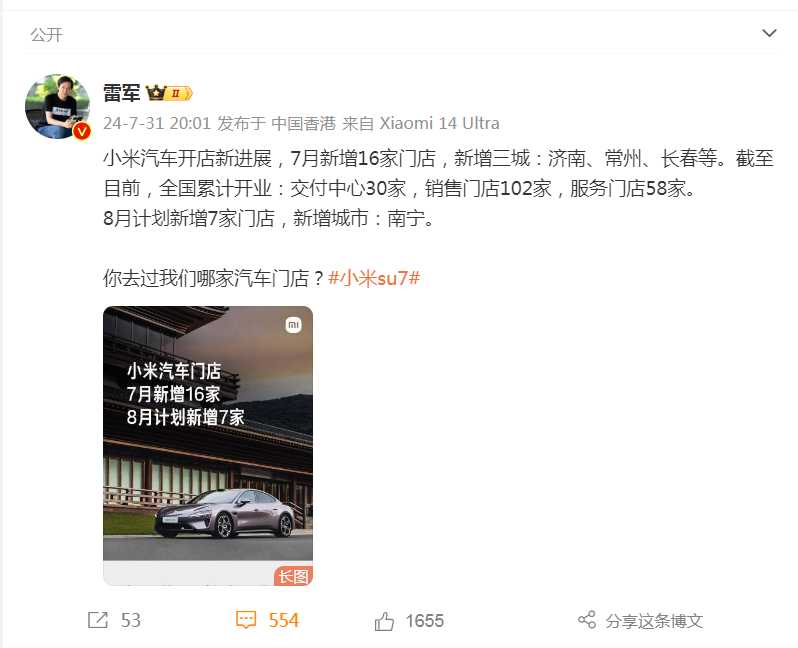 7月31日晚间,雷军在微博透露了小米汽车开店新进展,7月新增16家门店,新增三城:济南、常州、长春等。截至目前,全国累计开业:交付中心30家,销售门店102家,服务门店58家。8月计划新增7家门店,新增城市:南宁。