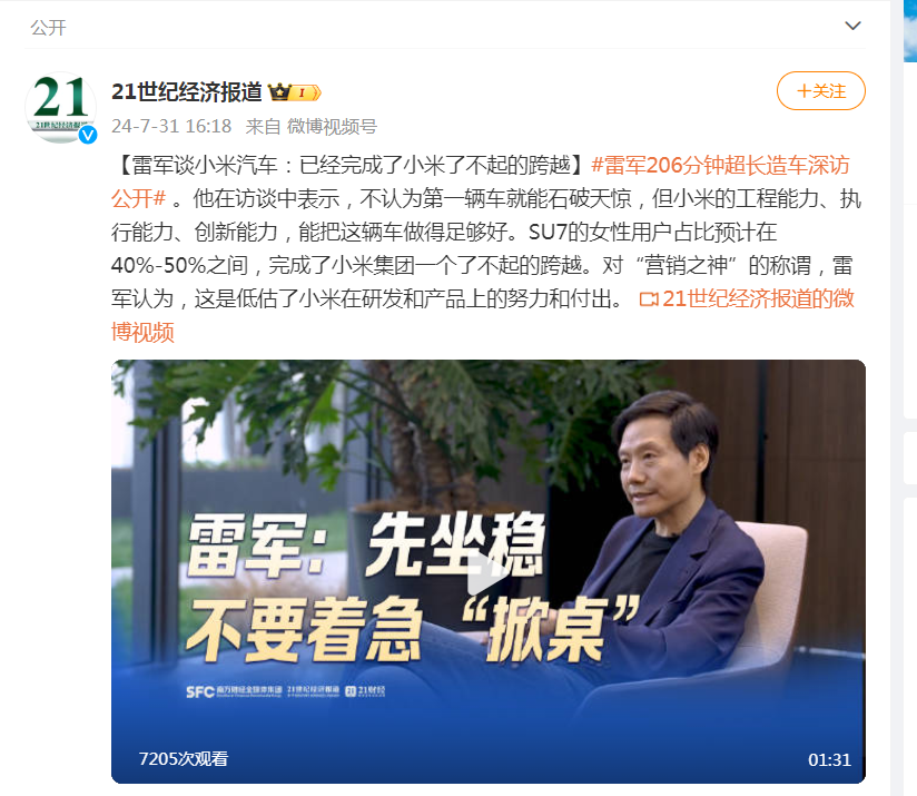 近日,小米集团创始人雷军在接受媒体采访时分享了他对小米首款电动汽车SU7的看法。雷军在访谈中表示,不认为第一辆车就能石破天惊,但小米的工程能力、执行能力、创新能力,能把这辆车做得足够好。SU7的女性用户占比预计在40%~50%之间,完成了小米集团一个了不起的跨越。对“营销之神”的称谓,雷军认为,这是低估了小米在研发和产品上的努力和付出。