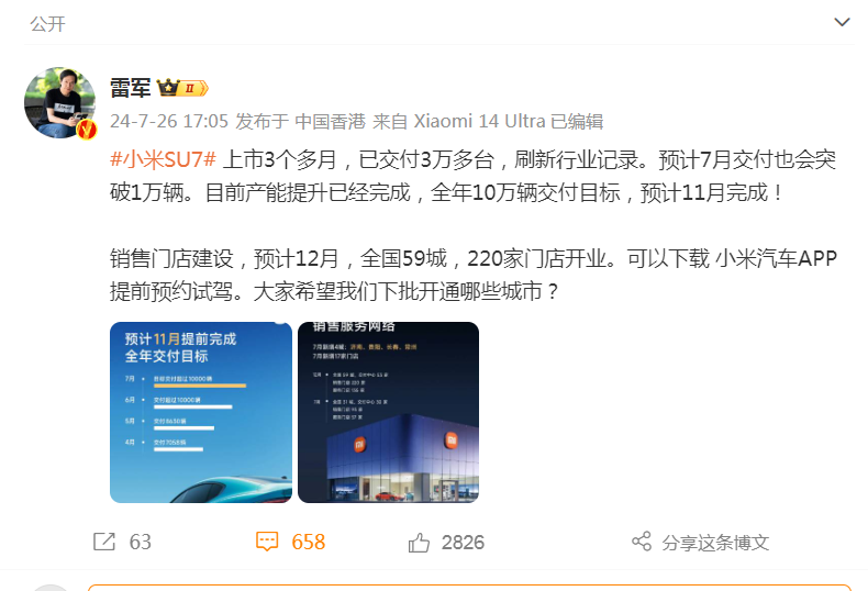 7月26日,雷军在微博上宣布小米SU7上市3个多月,已交付3万多台,刷新行业纪录。目前产能提升已经完成,全年10万辆交付目标,预计11月完成!