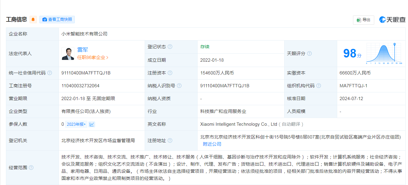 天眼查显示,小米景曦是小米智能技术有限公司(以下简称小米智能)全资子公司,而小米智能的法定代表人正是雷军。