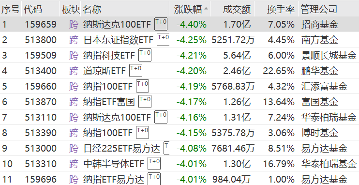 日本东证指数ETF、纳指科技ETF、道琼斯ETF、纳指100ETF、纳指ETF富国等投资日本、美国市场的跨境ETF纷纷重挫超4%。此外,中韩半导体ETF、亚太精选ETF等同样出现较大幅度的下跌。