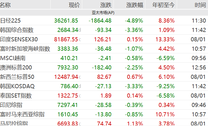 隔夜美股大跌产生全球连锁反应。8月2日上午亚太股市开盘即陷入风雨飘摇之中,呈现全线崩跌态势。其中日本股市跌幅尤甚,日经225指数盘中大跌超5%。