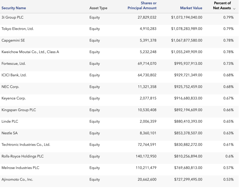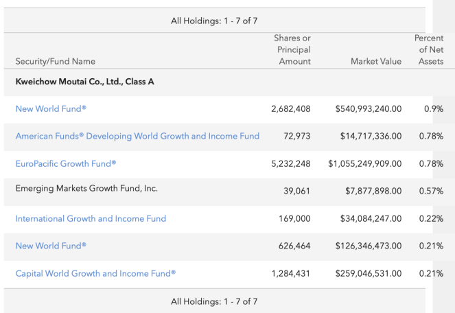 其中,“资本世界成长和收益基金(Capital World Growth and Income Fund)”最新规模为1237.74亿美元。截至二季度末,基金持有贵州茅台128.44万股。