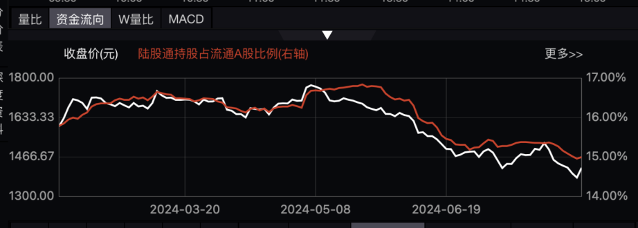 不过,针对贵州茅台,目前市场存在较大分歧。伴随股价调整,部分资金撤离。例如,自五月以来,北向资金持有贵州茅台占据流通A股的比例下降。