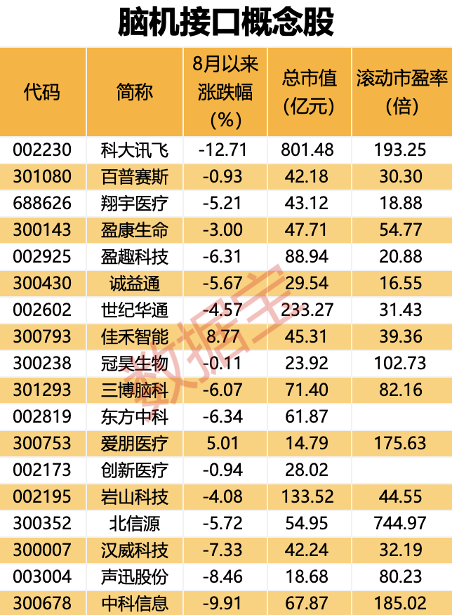 据证券时报·数据宝统计,A股中布局脑机接口或脑科学的上市公司共有18家,本月以来普遍下跌,平均跌幅达到4.09%,仅佳禾智能、爱朋医疗实现上涨。