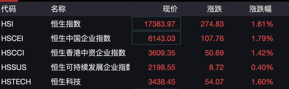 港股市场上午也高开,截至发稿,恒生指数、恒生科技指数涨幅均超过1%。