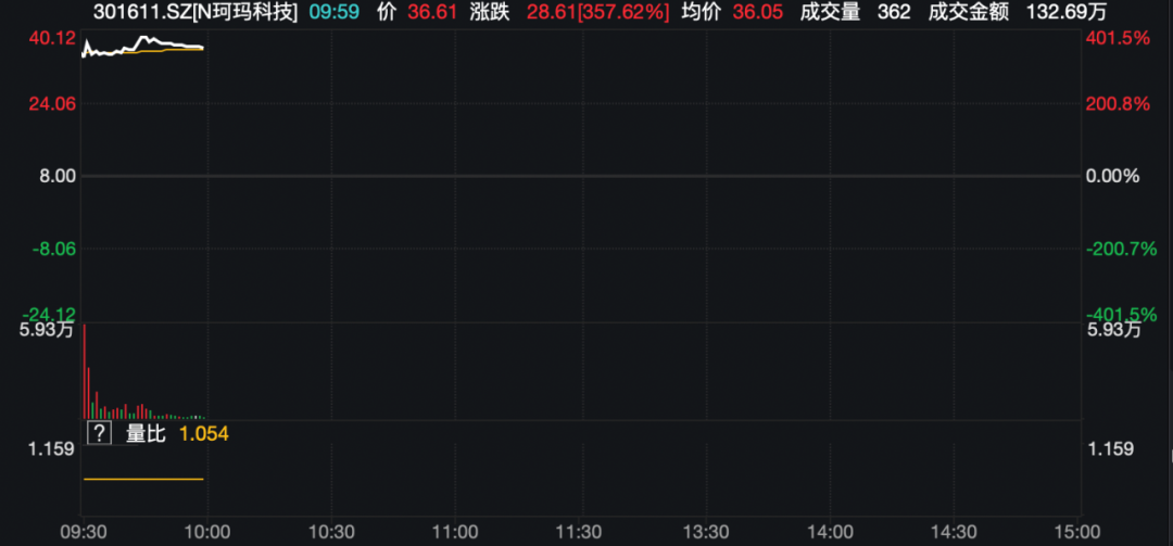 今天A股市场有一只新股上市,为珂玛科技,盘中一度涨超400%,截至发稿涨357.62%。