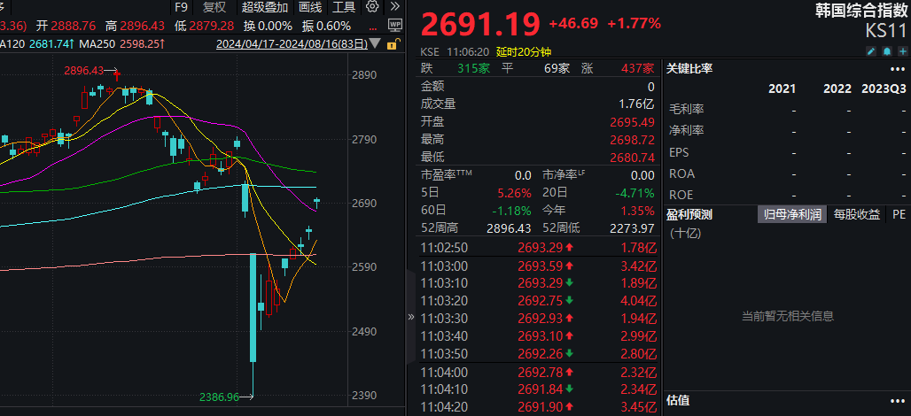 除了日本股市外,韩国股市上午也大幅上涨,韩国综合指数盘中涨幅一度超过2%,已收复8月5日暴跌产生的失地。此前的8月5日,韩国综合指数收盘暴跌8.77%。