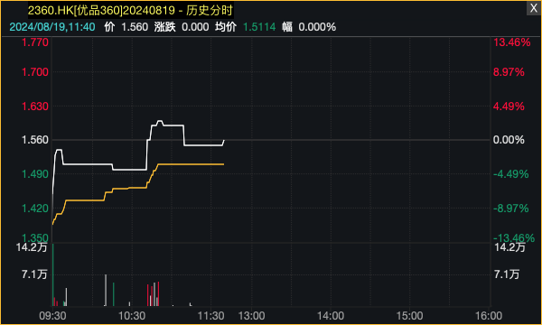 8月19日,港股优品360(02360.HK)盘初一度跌超13%至1.35港元,创2022年8月以来新低。但随后盘中拉升,一度翻红。截至发稿,该股下跌0.64%报1.55港元/股。