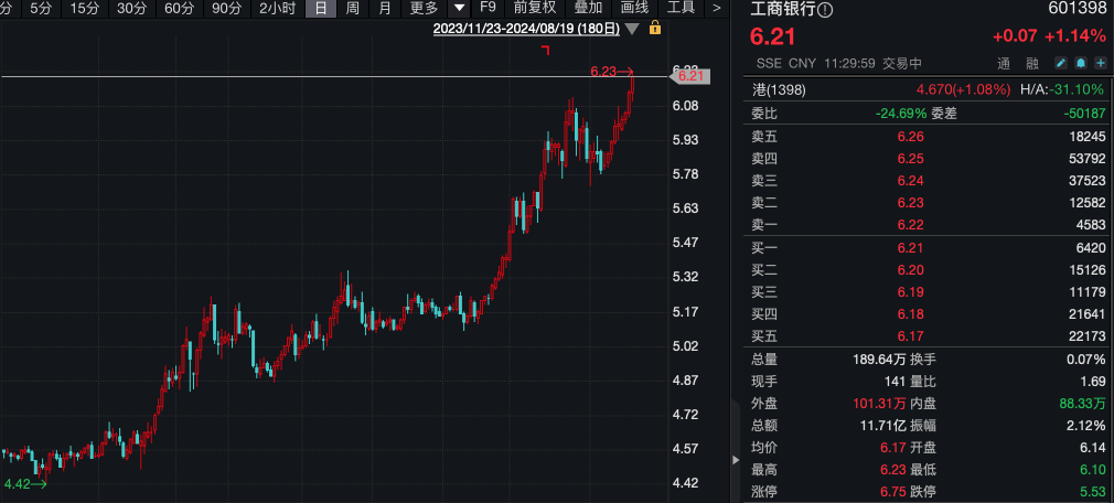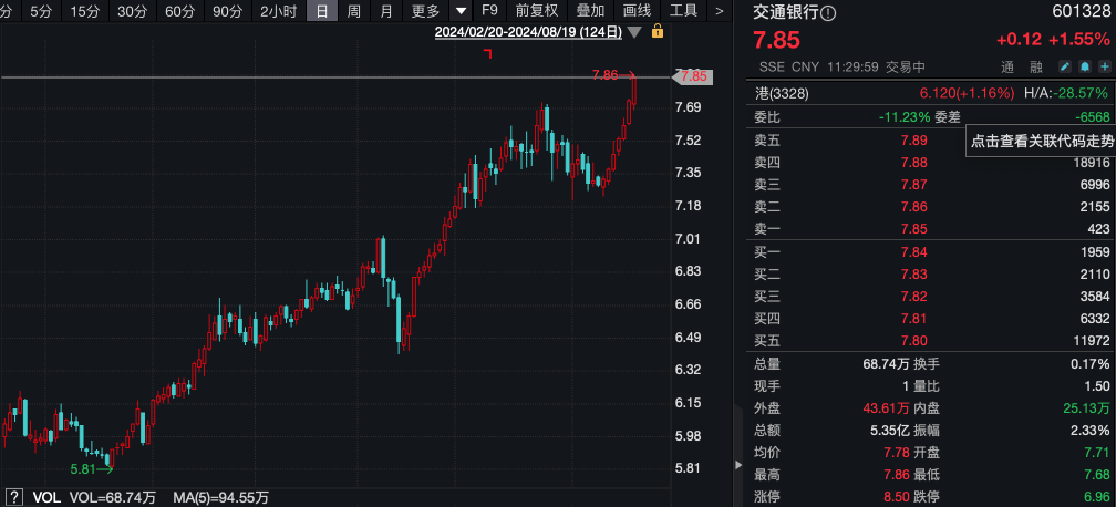A股银行股持续走强 ,8月19日工、农、中、建四大国有银行早盘续创历史新高,交通银行、浦发银行、光大银行创年内新高。