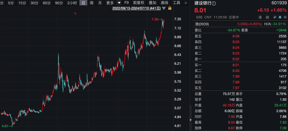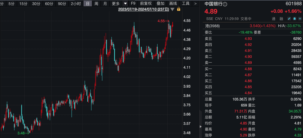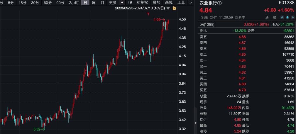 据统计,A股工商银行年内累涨37%,农业银行年内累涨40%,中国银行年内累涨29%,建设银行年内累涨30%。