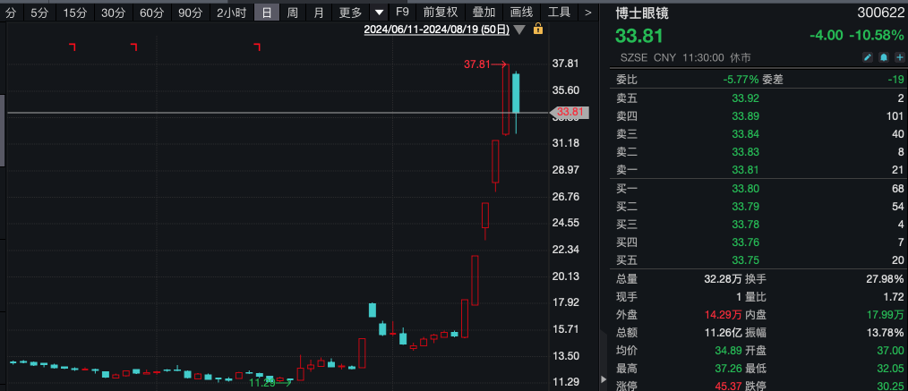 博士眼镜早盘下跌10.58%,报33.81元/股,半日成交11.26亿元。