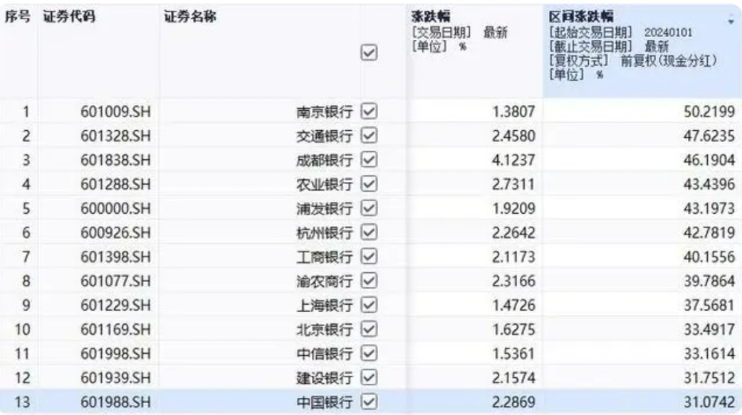 同花顺iFinD数据显示,今年以来截至8月19日收盘,A股上市的42家银行(申万行业)中,仅有3只出现下跌,其他均呈现上涨。13只个股的涨幅超过30%。其中,南京银行涨幅最大,年内上涨50.22%,其次是交通银行,涨47.62%。