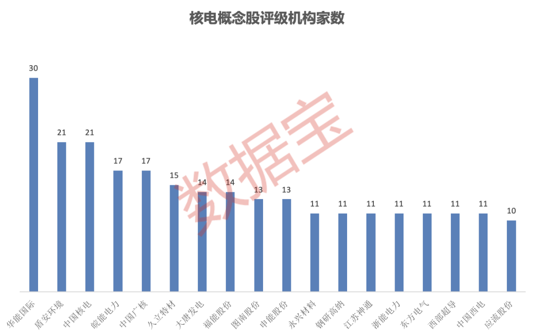 据证券时报·数据宝统计,从机构关注度看,A股核电概念中,18股的机构评级家数在10家及以上。其中,华能国际、盾安环境、中国核电、皖能电力、中国广核排名前五,依次有30家、21家、21家、17家、17家机构进行评级。
