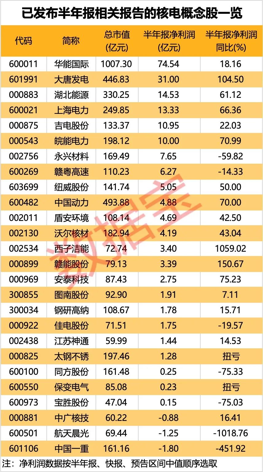 据数据宝统计,截至目前,已有26只核电概念股发布了半年报相关报告。从净利润规模看,华能国际、大唐发电净利润金额居前,依次为74.54亿元、31亿元;其后湖北能源、上海电力、吉电股份、皖能电力等净利润均在10亿元以上。