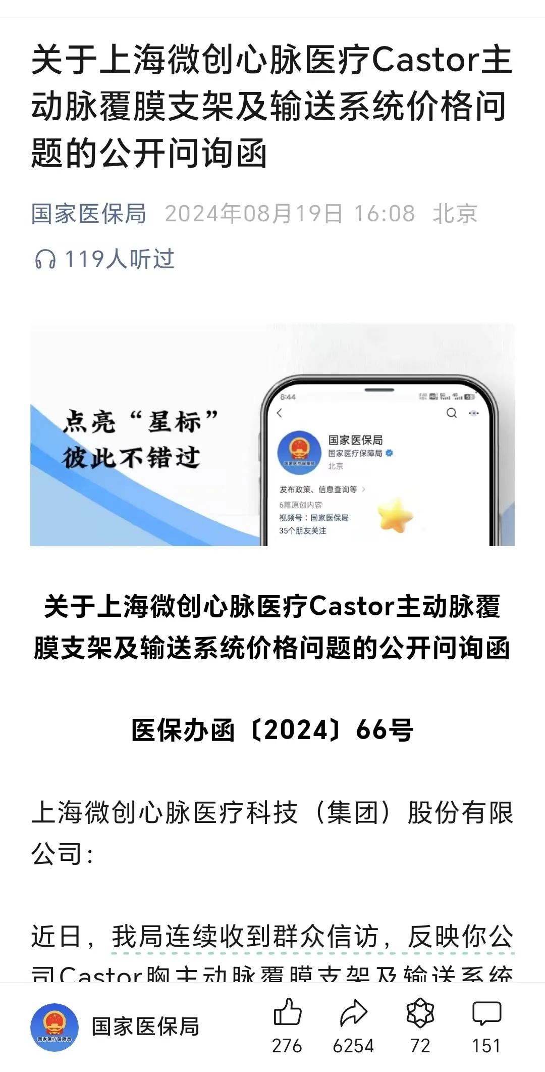 8月19日下午,国家医保局在其官网和官方微信号发布对心脉医疗的公开问询函。