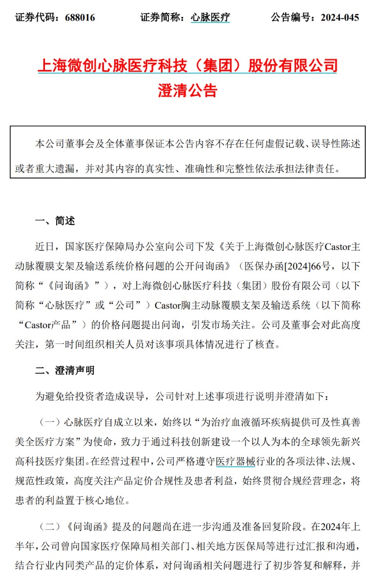 对此,心脉医疗8月20日早间回应称,“公司愿意在国家医保局指导下,进一步主动进行价格调整,使优秀的产品惠及更多患者。”
