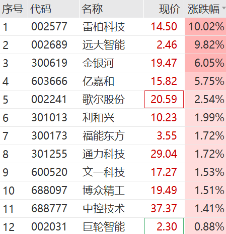 上午机器人概念活跃,雷柏科技、远大智能涨停,亿嘉和触及涨停板,金银河、利和兴、歌尔股份等跟涨。