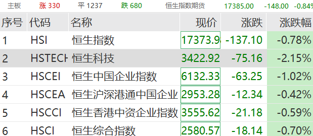 港股早间开盘跌幅明显:恒生指数跌1.13%,恒生科技跌2.75%,恒生国企跌1.42%。截至发稿,港股跌幅有所收窄;京东集团、快手领跌恒生科技。