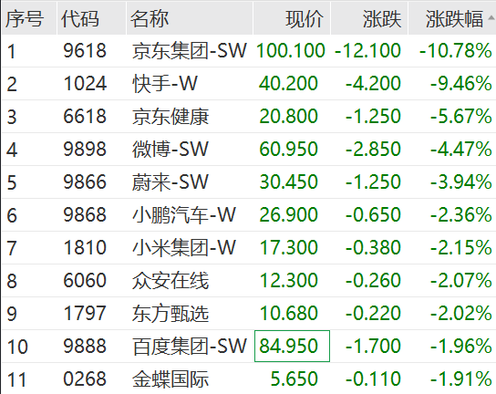 京东集团、快手盘中跌逾12%