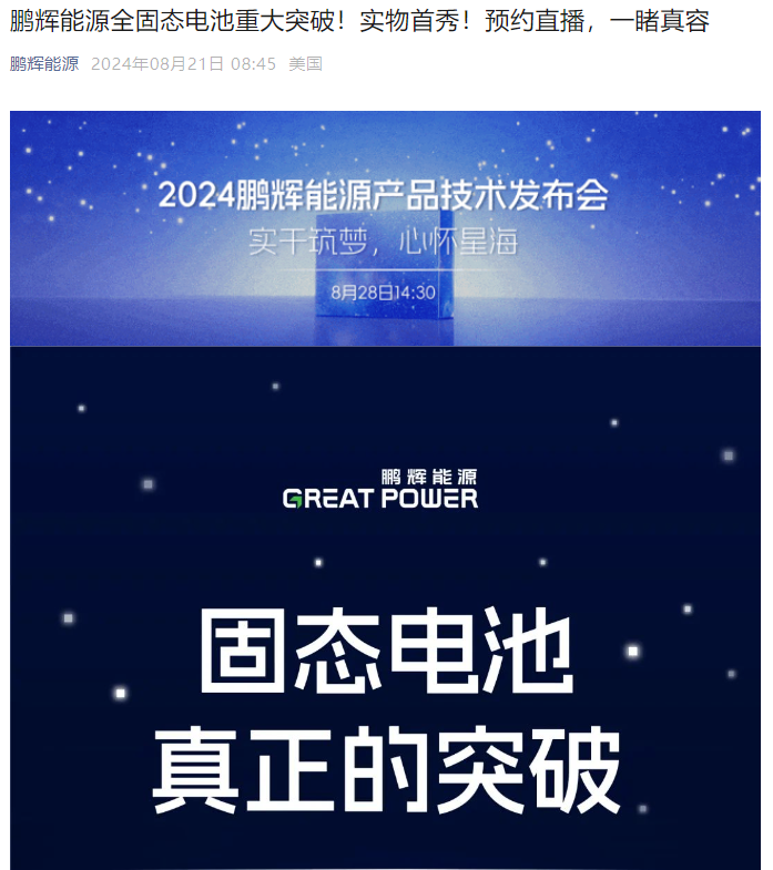 8月21日,鹏辉能源官微发布消息称,鹏辉能源全固态电池重大突破,将于8月28日举行2024鹏辉能源产品技术发布会。