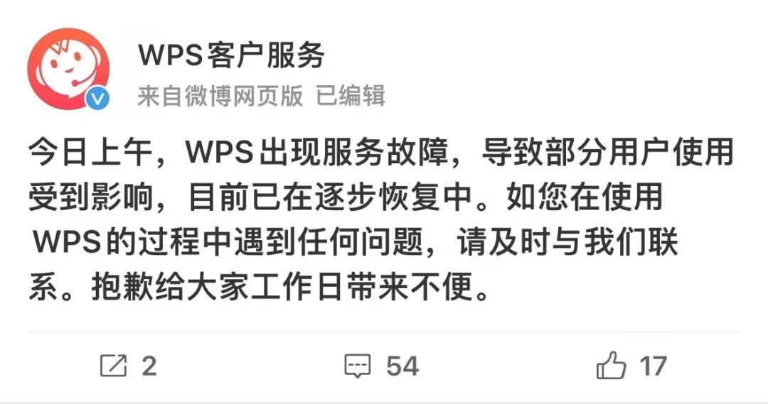 WPS客户服务随后也通过官方微博表示:WPS出现服务故障,导致部分用户使用受到影响,目前已在逐步恢复中。