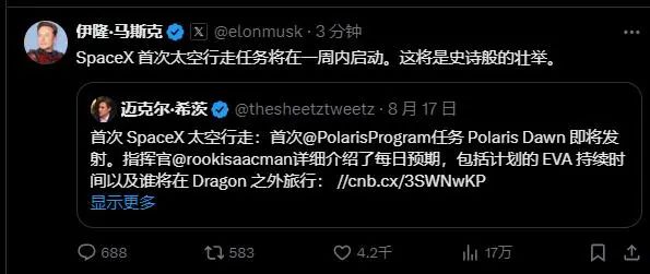 环球时报援引美国有线电视新闻网(CNN)19日介绍称,SpaceX确定了首次商业太空行走任务的执行时间表,预计将在8月26日由SpaceX的载人“龙”飞船搭载4名宇航员进行为期5天的太空旅行,他们将在距离地球约1400公里的轨道完成一系列测试。该任务被命名为“北极星黎明”。