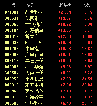 早盘,华为海思概念股掀涨停潮。同花顺发布的华为海思概念指数半日大涨5.42%,优博讯、世纪鼎利、深圳华强、中电港、广电计量等多股涨停,其中,深圳华强近期收获7连板。